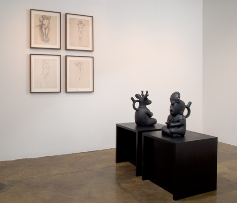 Nathan Mabry's exhibition at Cherry and Martin will include new bronze sculptures in which figures derived from Pre-Columbian Moche ceramics surmount stools based on Donald Judd's furniture-making practice. The figures make the 'in-and-out' sign with their fingers, a waggish gesture signifying sexual intercourse that in this work serves in part to align the repetition of sex with the repetition of Minimalism's own raw gestures. Also in the exhibition will be a new large-scale drawing on Mylar with colored pencil and Swarovski crystals. A work in Mabry's Mosaic Skull series, the drawing conjoins the ancient bling of Mexican Mixtec culture from the time of the Spanish conquest with the iconic tooth jewelry of modern hip-hop: the grill.
