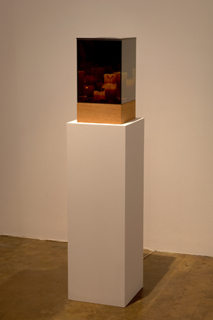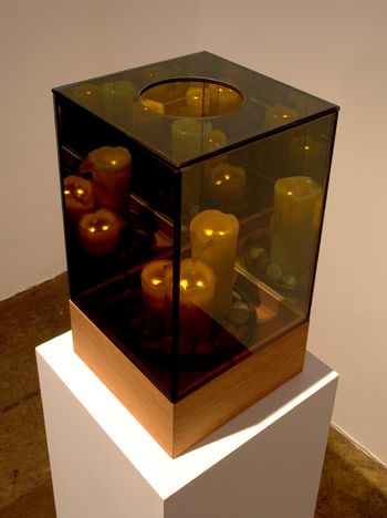 Noah Sheldon, who first studied to be a composer at the New England Conservatory of Music, transforms space through a methodical juxtaposition of sculpture, photography, video, light and sound. Sheldon’s installations often combine mundane sculptural materials with subtle yet intricate nuances, such as luminous or acoustic elements. The result is meditative. For example, Sheldon’s 2007 solo exhibition at D’Amelio Terras consisted in part of a kind of synthetic hypnotic Zen garden complete with mechanical wind chimes, a trickling fountain and pink fluorescent lights. A second installation by the artist included a picnic bench scattered with envelopes from the local film developing shop that contained snapshots of Sheldon’s most recent road trip. Sheldon encourages the viewer to slow down, become aware of their atmospheric surroundings, stay as long as they like and leave with the nostalgia of their own personal experience.