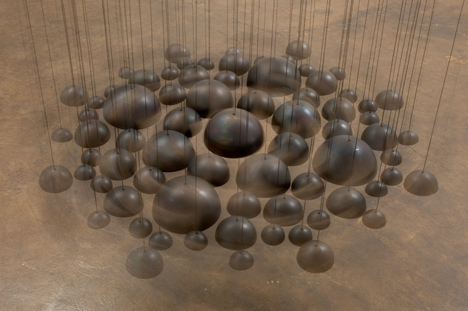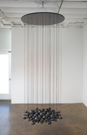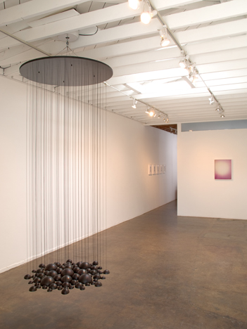 In his exhibition at Cherry and Martin, Noah Sheldon will use the front gallery to house one of his perpetual wind chime sculptures. Constructed out of fragmented building materials such as wood, steel, metal cable and fence post caps, these sculptures resemble an oversized version of your typical porch ornamentation. Complete with a motor that gives the strings intermittent tugs and causes the chimes to gently strike each other, Sheldon has designed a wind-driven percussion instrument traditionally hung outdoors for an indoor space (with no wind).