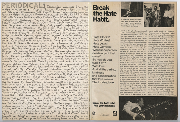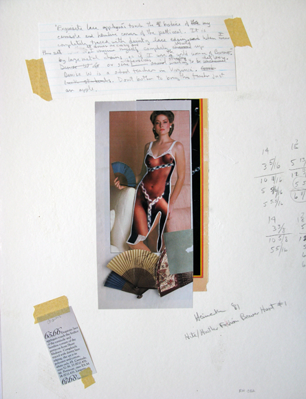 The Robert Heinecken works included in the exhibition include a complete group of his magazine pieces. Although not intended serially, the magazines exhibited at Cherry and Martin will present the practice in its entirety, encompassing at least one variant of all the magazines made by Heinecken from 1969-1971, picking up again in 1990, in 1993, and in 1999. Additionally, the exhibition will feature works from Heinecken's "Hite Hustler Beaver Hunt" series, his "Socio/Fashio Lingerie" series (both series are 1981), as well as color and black and white photograms from the 1960’s and 1980’s.
