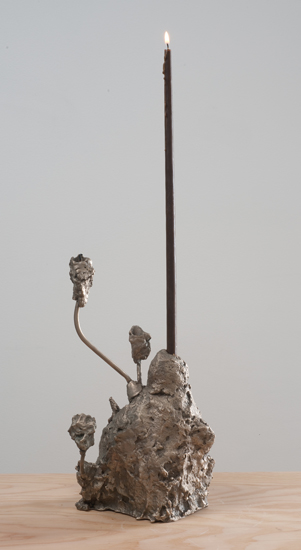 Eastman's work encourages critical dialogue about the value we place on objects – be they functional or decorative, or both. In the painting Untitled (2011), Eastman depicts a topographic portrait of a woman’s face, replete with manipulated, cut and pinned canvas, glitter, and ink drawing over subtle color washes – the effect is one of multiplicity and simplicity combined. In the bronze, clay and stone sculptures on view, Eastman deftly balances their object-ness with image – their function as candlesticks with their inherent decorative qualities – to deliver a fresh perspective on the debate.
