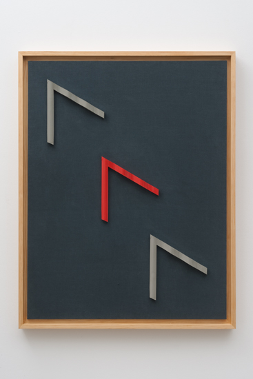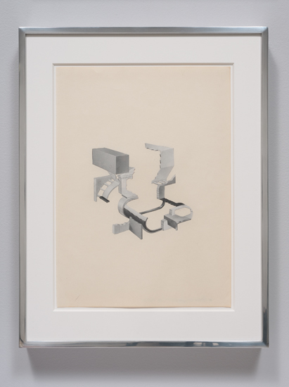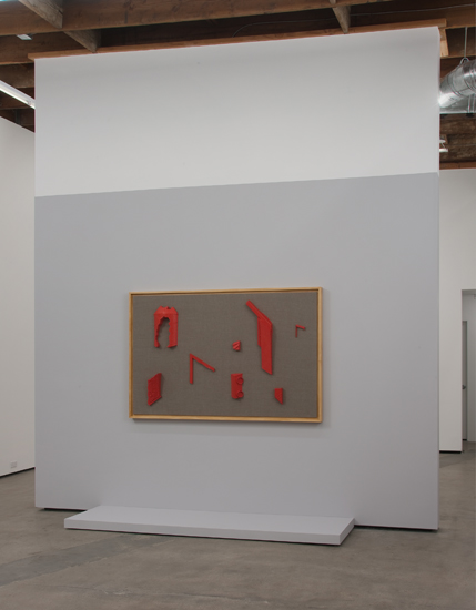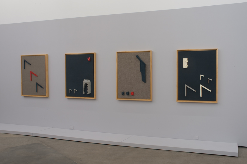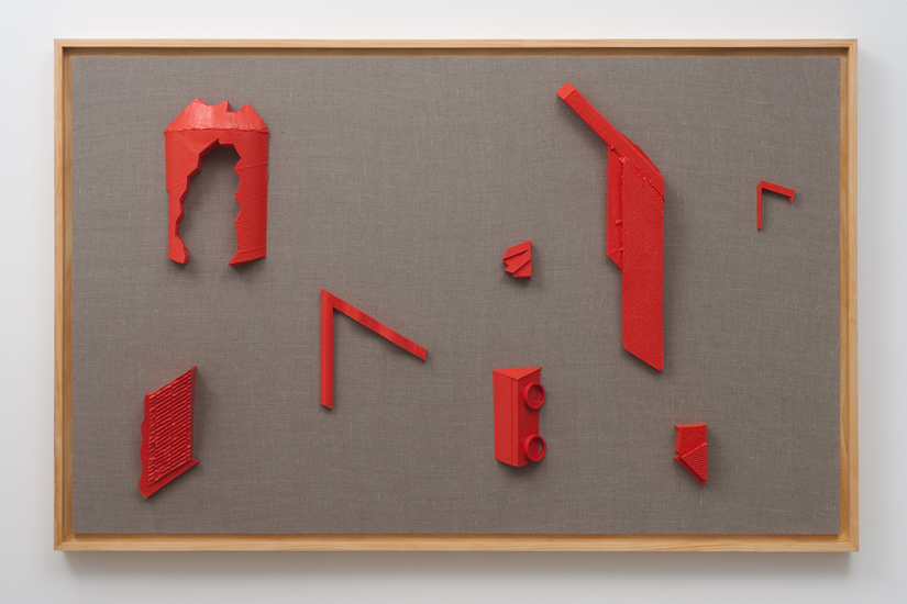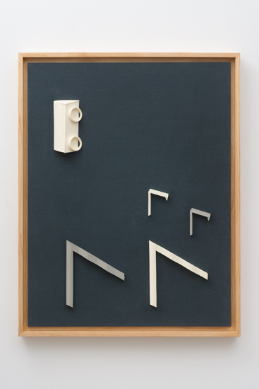 In its staging of these ersatz specimens, Dr. (illegible) traces a quixotic combination of morphologic diagnosis with the lyrical composition of abstract parts. The exhibition’s central illustration—a once discernable machine surgically reduced to an illogical hull and its extracted organs— is recreated as a wooden model and a set of colored plastic morphemes. These molded symbols are incorporated into an ordered sequence of linear display, where their repetition and chromatic coding suggest the transcription of a musical score, an archaeological catalog, or a hieroglyphic system of unknown purpose.