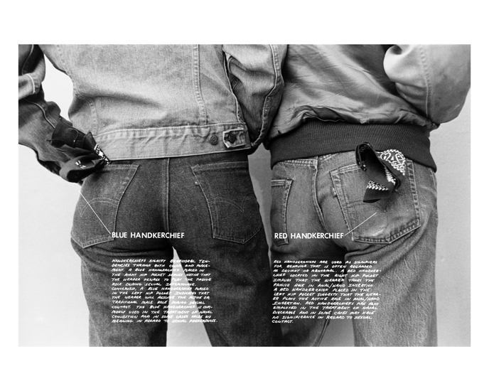 Gay Semiotics is one of the first conceptual works to bring the language of structuralism and linguistics into photographic practice. First seen in Hal Fischer’s 1977 exhibition at San Francisco’s Lawson de Celle Gallery, Gay Semiotics presents the codes of sexual orientation and identification Fischer saw in San Francisco’s Castro and Haight Ashbury districts as a tongue-in-cheek anthropological essay. Twenty-four photographs—with text printed into the photographs—are codified as “Archetypal Media Images,” “Signifiers, “Street Fashion, and “Fetish.”
