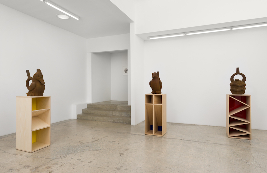 Nathan Mabry’s T/O/T/E/M multi-part sculptures utilize as one element a terra-cotta form derived from Peruvian Moche culture (100-700AD). In their original context, these forms were intended by their users to activate power with regard to life, fertility, and the cosmos. When combined with base forms loosely derived from 60s American Minimalist figures - a classic post-science art movement - the effect is uncanny. Neither form is able to operate in its original framework; the resulting cyborg forces each system of representation to wear the clothes of the other, as it were, and for the user to interpret the final result.