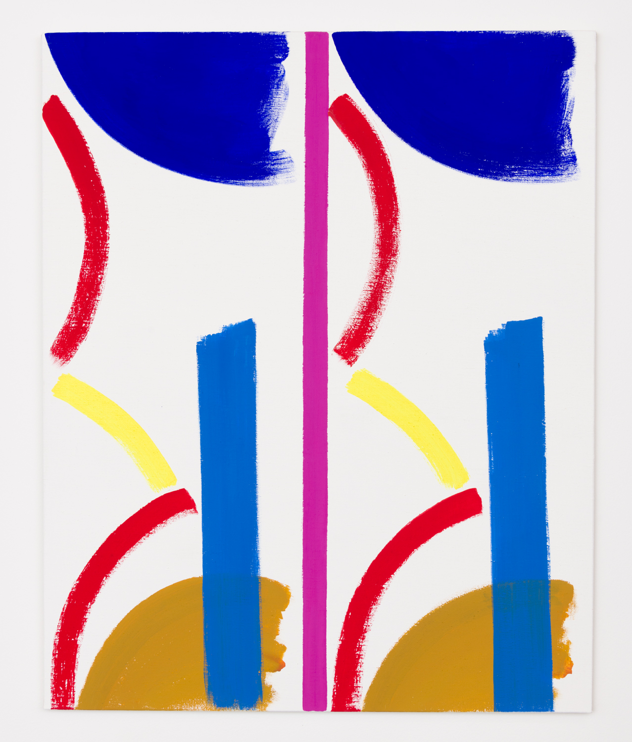 In Piffaretti’s work, duplication is a question, and in some sense it is a negation. But it is not a negation fraught with heroic pathos. And it is not a copy. Piffaretti writes that, “a copy is made in relation to a final state.” Duplication is a postponement - a break in the action that allows the viewer to see both sides of the canvas. An uncanny pattern emerges in Bernard Piffaretti’s paintings as Arielle Blair has written, “the eye wanders back and forth attempting to unlock the puzzle of the self-contained meme and decode the artist’s experiments in variation.” “The principle rule of dividing the canvas,” provides “a platform while functioning as an anchoring device of each painting.” “Piffaretti’s duplicated paintings are neither exact copies of one another, nor are they independent images.” They “make us do a double take, defying the stagnancy of certain abstract painting.”